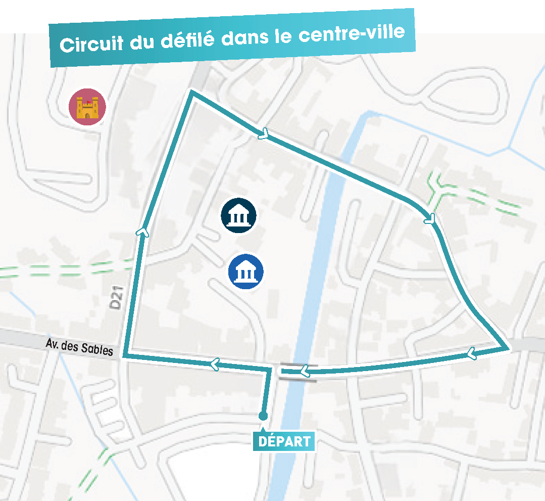 Le premier tour du défilé partira place du Payré à 15h. Il passera par la rue Nationale, longera la place du Château, avant d’emprunter la rue du Centre, puis rejoindre à nouveau la place du Payré par la rue Nationale. À 18h30, le second tour du défilé empruntera le même itinéraire.