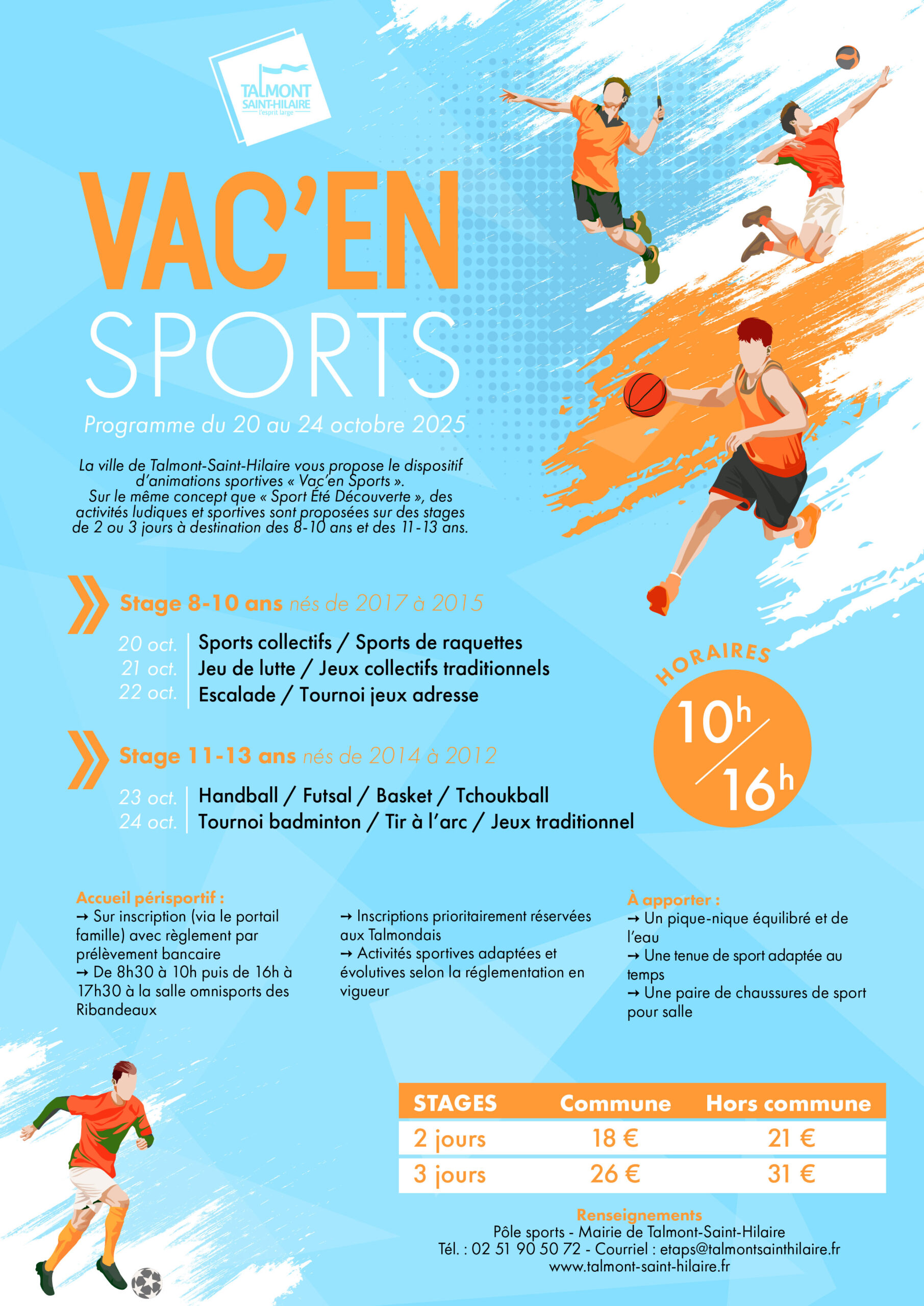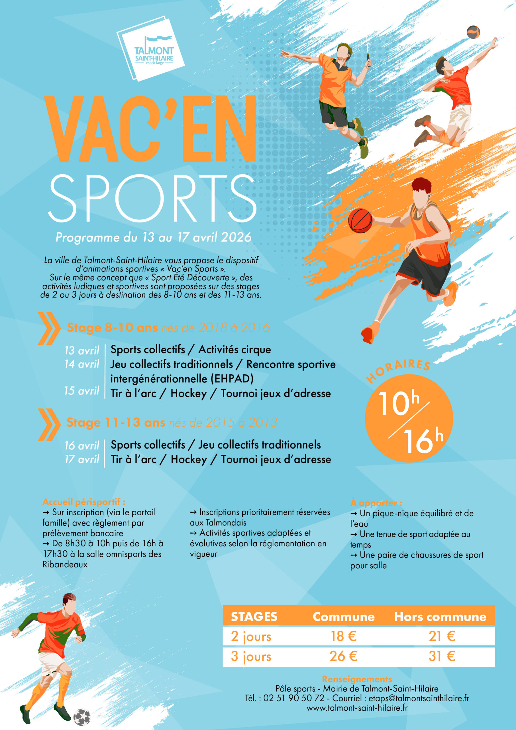 Depuis plus de 20 ans, Sport-Eté-Découverte propose des stages multi-sports en juillet et août. L’offre sportive à destination des jeunes Talmondais s’étoffe sur la commune. La Ville ajoute des animations sportives aux petites vacances. Le dispositif « Vac’en Sports » programme ainsi une semaine d’activités durant les vacances de février, d’avril et d’octobre.